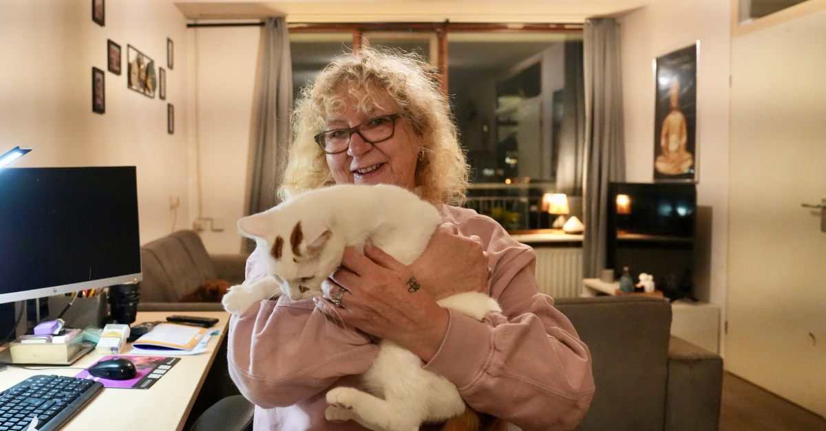 Ze is dol op haar huis. “Ik woon hier nu 3 jaar. En dit is mijn laatste huis, mij krijgen ze hier niet meer weg!” Ze heeft veel contacten op haar verdieping en daar spreekt ook haar sociale hart. “We wonen hier met 9 huishoudens. Voor mijn overbuurvrouw doe ik de boodschappen en ik kook voor haar. En ik heb een rollator voor haar gekocht. Je moet elkaar toch helpen? Ik vraag me wel eens af waar de mentaliteit van mensen is gebleven. Als er iets gebeurt, sta je voor elkaar klaar. Ze staan ook voor mij klaar als ik het nodig heb, dat weet ik zeker. En het is gezellig. De overbuurvrouw komt op kerstavond bij me eten. Hartstikke leuk.”