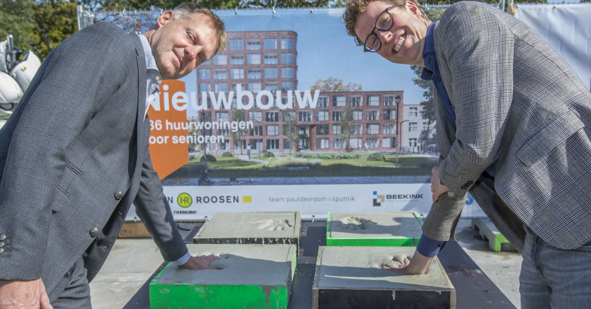Donderdag 22 september was het officiële startsein voor de bouw van 136 sociale huurappartementen in de Wenckebachstraat. Het voormalig verzorgingshuis op de hoek van de Wenckebachstraat en de Noordpolderkade is gesloopt. Er komt een nieuw duurzaam woongebouw speciaal voor ouderen. Gijsbert van Herk, bestuursvoorzitter Staedion en Martijn Balster, wethouder Wonen, Wijken en Welzijn startten de bouw door hun handafdrukken in het beton te zetten.